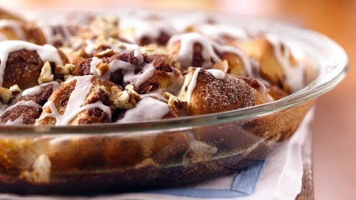 3. Bake at 375°F. for 18 to 20 minutes or until golden brown. Drizzle icing over rolls; sprinkle with remaining nuts. Cut into wedges. Serve warm.