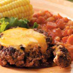 Nutritional Analysis: 1 patty with 1/2 cup tomato mixture equals 483 calories, 23 g fat (10 g saturated fat), 125 mg cholesterol, 945 mg sodium, 17 g carbohydrate, 1 g fiber, 36 g protein.