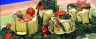 Brush eight 3 X 1 1/2-inch ramekins or muffin tins with olive oil. Line each one with overlapping strips of the zucchini. Make sure there are no gaps. Set aside.