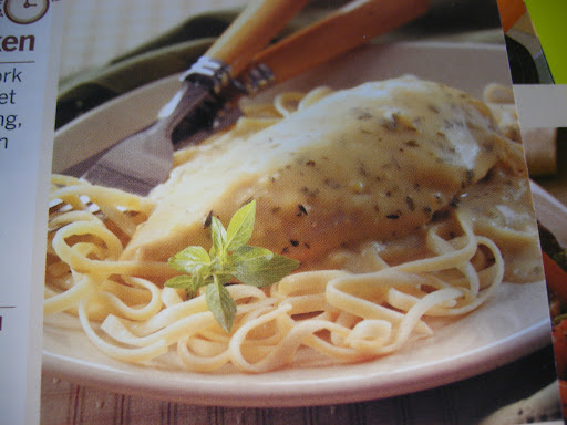 Place chicken in a 3qt. slow cooker. Combine the soup, milk, sauce mix, thyme and parsley; pour over chicken. Cover and cook on low for 4-5 hours or till a meat thermometer reads 170. Serve over fettucine.