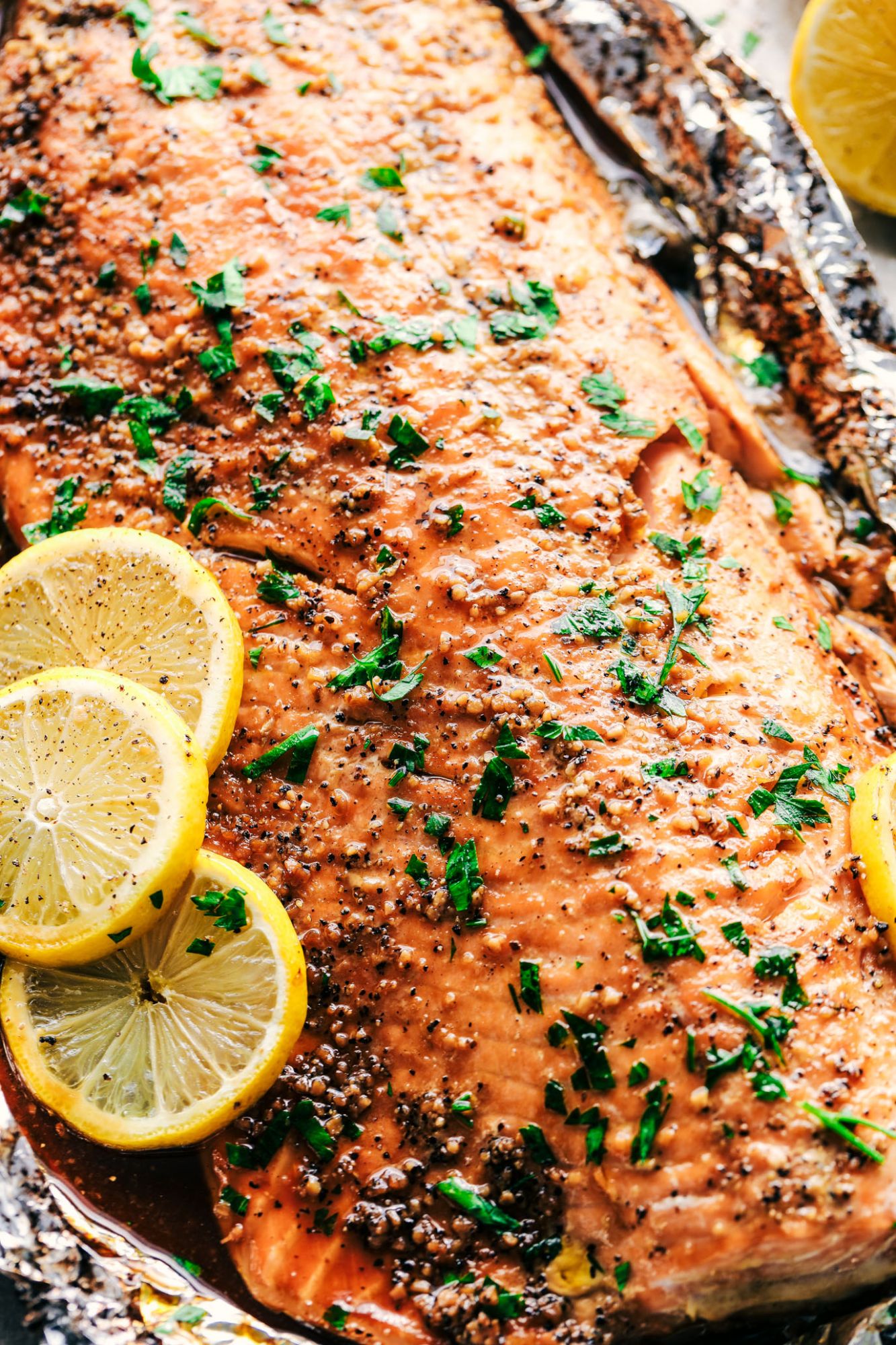 Bake for 20-25 minutes or until salmon is cooked throughout. Take the foil off of the top and baste the salmon with the sauce in the foil. Broil for 3-5 minutes or until brown and caramelized. Garnish with lemon slices and chopped parsley if desired.