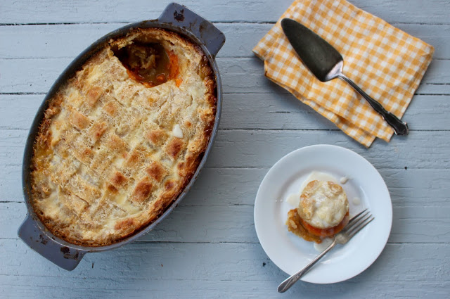 2. Butter and lightly flour a 13x9 inch baking dish (or a dish with an equivalent capacity and at least 2-inches deep). On a floured surface, roll out half of the chilled dough into a large rectangle that will cover the bottom and sides of the baking dish. Transfer the rolled-out dough to the prepared baking dish, and press it down gently to line the dish and form the bottom crust. Place the dish in the fridge to chill.