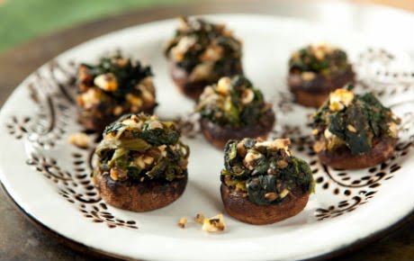 HEAT oven to 400F. Mix stuffing mix and water. Remove mushroom stems; chop stems. Melt butter in skillet. Add stems and garlic; cook and stir until tender. Add to stuffing with spinach and cheese; mix well.