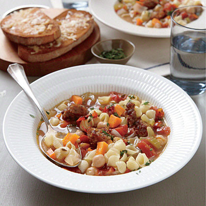 2. While pasta cooks, heat a large saucepan over medium-high heat. Add oil to pan; swirl to coat. Add sausage; cook 3 minutes or until lightly browned, stirring to crumble. Add onion and next 6 ingredients (through garlic); cook 10 minutes. Add chickpeas, tomatoes, zucchini and stock; bring to a boil. Reduce heat, and simmer 5 minutes. Stir in pasta, salt, and black pepper; cook 1 minute.