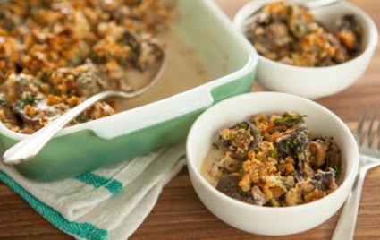 Oil a 1 1/2-quart gratin dish or 8-inch-square baking dish. In a large bowl, stir together half-and-half, half of the cheese, pepper, nutmeg and remaining 1/4 teaspoon salt. Stir in roasted mushrooms and charred mushrooms. Pour mixture into a gratin dish and press down gently with the back of a spoon to level. Sprinkle with remaining cheese, parsley and bread crumbs. Lower the oven temperature to 350°F; bake gratin until top is well-browned and edges are bubbling, about 40 minutes. Cool 10 minutes before serving.