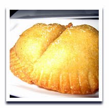8. Fold the round over and press edges together.Take a fork and dip in flour and press along edge to seal.Make a couple of pricks in dough not large.Small enough to let steam out. Bake on ungreased cookie sheet 15 to 20 minutes. Remove from baking sheet and roll in traditional sugar and cinnamon mixture or confectioners' sugar.
