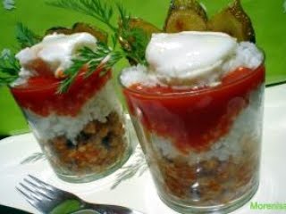 Para servir, poner todo en un cuenco transparente, por capas: carne, arroz, salsa de tomate, huevos y plátano.