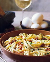 In a small skillet, heat the oil and butter over medium heat. Add the bacon and cook until brown but not crisp, about 4 minutes. Add the garlic, wine, and pepper. Simmer until the wine is reduced to 2 tablespoons, about 3 minutes. Remove from the heat. In a large bowl, whisk together the eggs, cheese, and salt. In a large pot of boiling, salted water, cook the linguine until just done, about 12 minutes. Drain the pasta, add it to the egg-and-cheese mixture, and toss quickly. Pour the bacon mixture over the linguine. Add the parsley and toss just until mixed. Serve immediately with additional Parmesan.