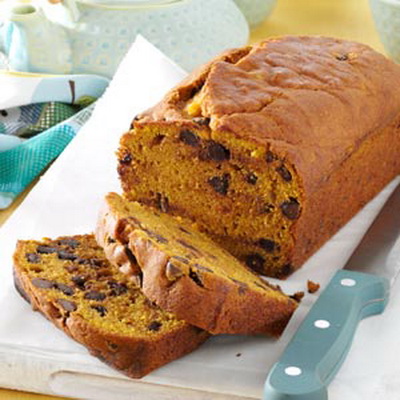 A touch of cinnamon helps blend the chocolate and pumpkin flavors in this tender bread. And since the recipe makes two loaves, you can send one to a bake sale and keep one at home for your family to enjoy. —Lora Stanley, Bennington, Kansas