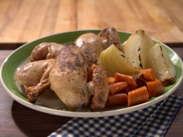 Place the chicken in a roasting pan and pat dry. Arrange the carrots and onions around the chicken. Scatter the orange zest on top of the chicken and place the orange pieces in the cavity.