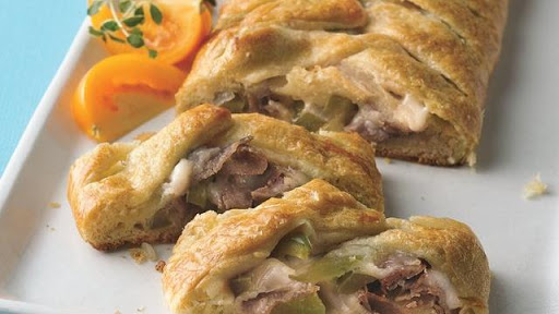 Make cuts 1 inch apart on long sides of rectangle just to edge of filling. For braided appearance, fold strips of dough at an angle halfway across filling with ends slightly overlapping, alternating from side to side. Fold ends of braid under to seal. On second ungreased cookie sheet, repeat with remaining can of dough, steak mixture and cheese. Brush braids with beaten egg.