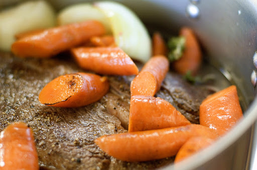 When the bottom of the pan is sufficiently deglazed, place the roast back into the pan and add enough beef stock to cover the meat halfway (about 2 to 3 cups). Add in the onion and the carrots, as well as 3 or 4 sprigs of fresh rosemary and about 3 sprigs of fresh thyme.