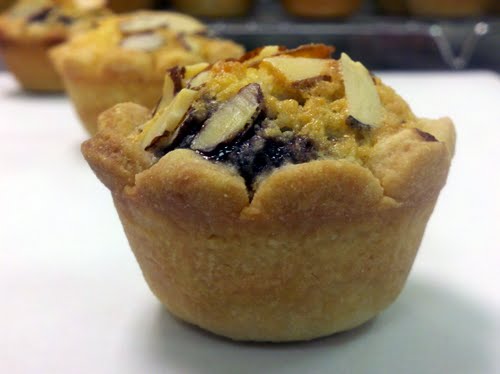 Drop a small amount (1-2 teaspoons) blueberry mixture into each pastry shell. Cover with an equal amount of frangipane, making sure that the blueberry is completely covered. If desired, sprinkle with sliced almonds.