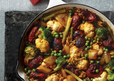 3. Sprinkle orzo into skillet, and stir 30 seconds. Stir in broth and peas, and reduce heat to medium. Arrange cauliflower florets on top of orzo in pot. Arrange green onions, tomatoes, and bell pepper pieces around cauliflower; cover, and simmer without stirring, 11 minutes. Scatter broccoli over vegetables, remove pot from heat, and let stand, covered, 10 minutes, or until orzo has absorbed all liquid and broccoli is crisp-tender.