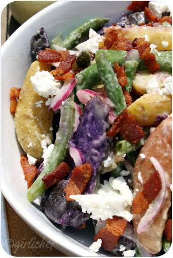 When you are ready to serve your potato salad, toss everything in the bowl around again. If you would like to add more of the vinaigrette, do that at this time (if not, reserve the remainder for another use). Toss in the reserved bacon and crumble in the Feta and serve.