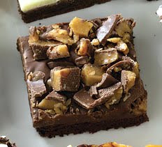 4. Sprinkle bars with toffee pieces, pressing slightly into chocolate. Refrigerate 30 minutes to firm. Remove from pan using foil; cut into bars.