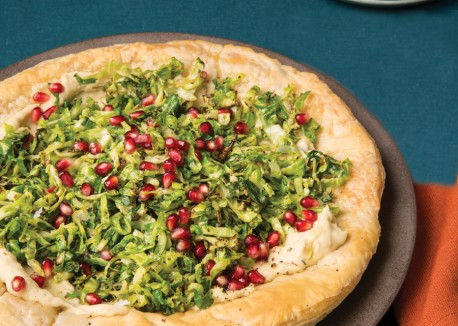 For a spectacular appetizer or light main course, white bean purée is spread on a crisp-from-the-oven puff pastry crust and sprinkled with warm Brussels sprouts and juicy fresh pomegranate seeds.