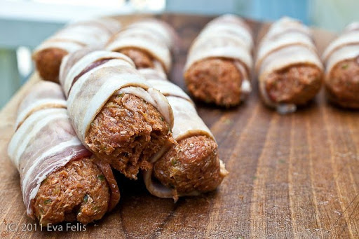 With wet fingers form a sausage like shape about 10 cm / 4 inch long, you should get 8 cevapcici. Roll every cevapcici in one slice of bacon. It will stick, you won’t need to fix it with a toothpick.