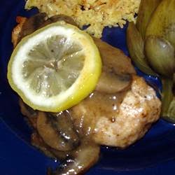 In a large skillet, melt the 1/4 cup butter or margarine. Add the sliced mushrooms. Cook and stir until the mushrooms are brown and have exuded their juices, about 6 minutes. Sprinkle with the flour and blend. Add the chicken broth, stirring to make a medium thick sauce. Allow to reduce, adjusting with a little more broth to make a creamy sauce. Add fresh parsley at the last minute. Spoon the sauce over the lemon baked chicken breasts. Delicious!