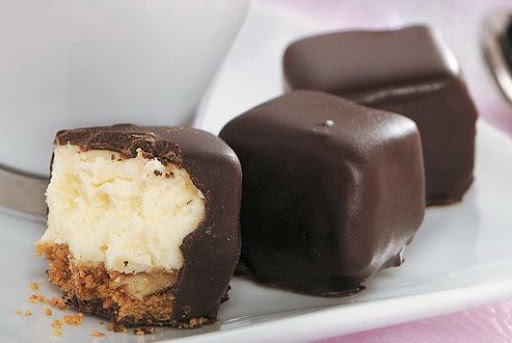 These are very good, but I needed something very fast one evening so I took a frozen cheesecake from my freezer, cut it into squares the best I could, used a fondue fork and dipped them into chocolate. They immediately cooled the chocolate, had a good thick coating and were very easy. I served with pretty bamboo toothpicks on a platter and they were all eaten! The worst part was throwing the 'scrapes' of the cheesecake out when I was cleaning up. I had the biggest urge to just eat them!!