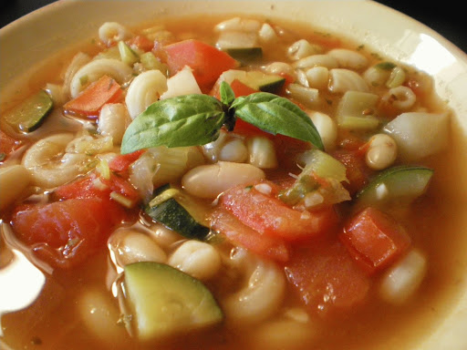Cut ham in 1/2" pieces, dice celery, slice carrots, chop onion, slice zucchini. Mash half of the beans. In hot oil, cook ham, celery, carrots, onion, zucchini, basil, and pepper until tender.