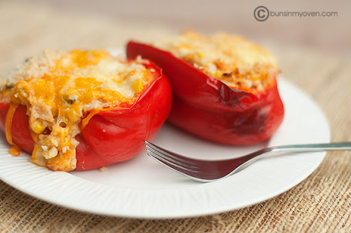 Stuff pepper halves with the rice/cheese mixture. Place in baking dish and bake for 20-25 minutes, or until heated through. Makes 4 servings.