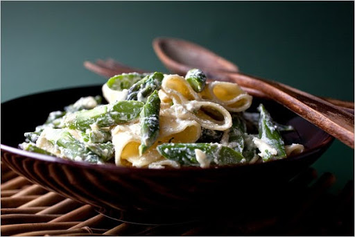 2. Add the lasagna noodles to the boiling water, and boil until cooked al dente -- firm to the bite. Meanwhile, place the ricotta in a large pasta bowl, and stir in the garlic. When the noodles are done, remove 1/2 cup of the pasta water, and add to the bowl with the ricotta. Mix together well, and add the asparagus, fresh herbs and Parmesan or pecorino to the bowl. Drain the lasagna, and toss with the ricotta mixture. Serve at once.