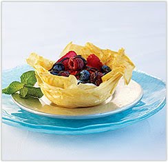 Combine berries with splenda. Spread 1 phyllo sheet out on a clean work surface. Lightly brush with margarine. Lay second sheet on top of first; brush with margarine. Fold sheets in half widthwise. Brush top side with more margarine. Cut dough in half lengthwise, then again widthwise to create 4 equal pieces.