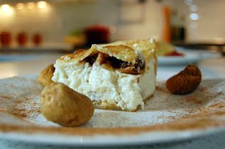 Bring milk to a boil and slowly add semolina, stirring constantly so the semolina does not clump. Cook mixture for approximately 8-10 minutes or until semolina is done. Take off heat and add a bit of pepper and all of the cheeses which you have grated. Mix well until cheeses have melted into the semolina mixture. Place one piece of the puff pastry on a floured work surface and roll out lightly before placing into the bottom of a lightly buttered 9”square baking pan. Top the puff pastry with ½ of the dried figs which have been quartered. Add the semolina mixture on top of the figs and top with the remaining half of the quartered figs.