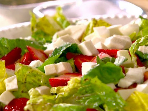 Toss the strawberries with the remaining dressing and place 1/4 of the berries on top of each mound of lettuce. Top each with cheese and sprinkle with the basil.