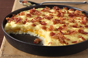 HEAT oven to 350ºF. Add butter and sour cream to potatoes; mash until smooth. Spoon half into 1-1/2-qt. casserole; cover with layers of cheese, remaining potato mixture and bacon.