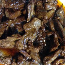 Strain the marinade and reserve the liquid. Turn the heat to medium low and return the solids to the pot, Saute until the onions caramelize, about 20 minutes. Add the liquid and cook until the onions absorb it, about 20 minutes. Add beef stock, boil, and remove pot from the heat.