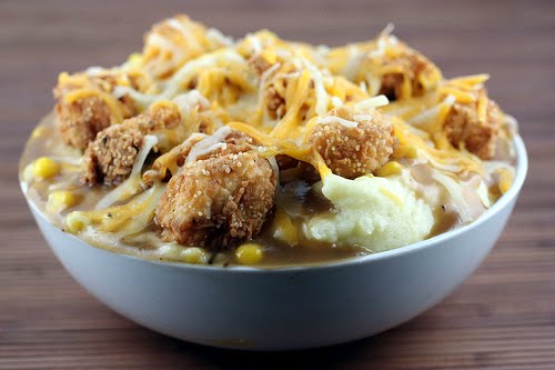 Step 3: To assemble potato bowls- Add a layer of mashed potato onto the bottom of a boil. Top with corn, chicken pieces, gravy and cheese. Divide the ingredients evenly within 4 bowls.