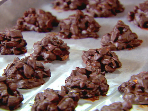Stir the fruit/nut mixture into the chocolate. Spoon out heaping tablespoon sized clusters of the chocolate mixture onto the baking sheet about 1” apart. Put them in the refrigerator to set for 15 minutes. Store and serve at room temperature.