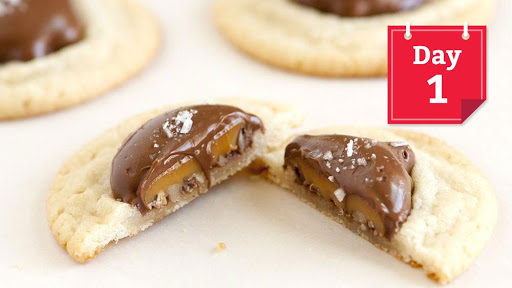 Gently push 1 turtle candy on top of each warm cookie; sprinkle with a little salt. Cool 3 minutes; remove from cookie sheets to cooling racks. Cool completely before storing.