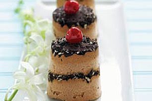 3) FREEZE 5 hours or until firm. Remove from freezer about 15 min. before serving. Let stand at room temperature to soften slightly. Peel away paper from souffles. Place souffles on plates; garnish with cherries