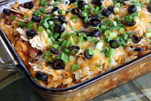 The colder weather is approaching and that means its time for some casserole dishes. This particular dish, taco casserole is one of my all time favorites. I have tried a few different taco casserole recipes, but I prefer this one with the pasta in it. Some of the ingredients in this dish include ground beef, onions, diced tomatoes, tomato soup and taco seasoning mix. Some toppings include black olives, cheese, and green onions. You could also add diced tomatoes, lettuce and sour cream if you choose. I find that added the crushed tortilla chips and the toppings within the last few minutes of baking works the best. This dish is best served immediately so the tortilla chips will still be crunchy. Enjoy.