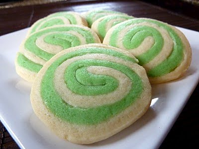 Brush the top of the plain dough with beaten egg white. Place the green dough on top and press down. Starting on a long side, roll the dough into a tight swirl. Brush the seam edge with egg white and pinch to seal. Wrap in parchment paper and refrigerate at least an hour.