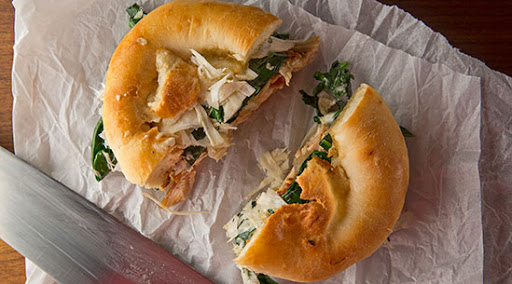 4. Assemble your Mattos sandwich: Place an oversized spoonful of crème fraiche on the bottom baily half. Top with the turkey meat and its juices, then lay the spigarello leaves and lardo over the turkey. Finish with large shards of thinly grated horseradish (a small handful). Season with salt, top with the second bialy half and eat.