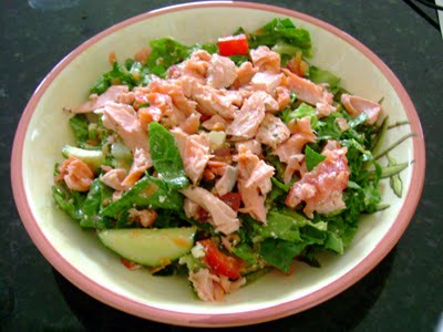 Mix together on finely diced onion, 2 cans of salmon, 1 can of drained peas, 2 stalks of chopped celery and ¼ cup of Mayo.