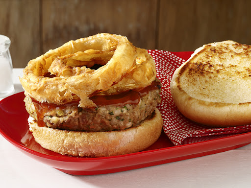 Preheat the broiler. Heat the remaining 1 tablespoon olive oil in a large nonstick skillet over medium heat. Working in batches, cook the patties until golden brown, about 6 minutes per side. Meanwhile, place the buns, cut-side up, on a broiler pan and broil until toasted, 1 to 2 minutes. Serve the patties on the buns; top with the remaining 2 tablespoons barbecue sauce and onion rings.