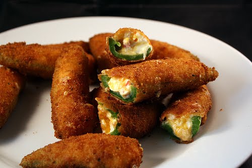These jalapeno poppers make a great appetizer for parties. They are basically stuffed jalapeno peppers that are breaded and fried. The filling ingredients include cream cheese, cheddar cheese and bacon bits. You can adjust the amount of bacon bits to your taste. When you are slicing and seeding the peppers it might be a good idea to wear rubber gloves because they can burn your hands if you are not careful. This recipe can easily be double for tripled if you want to make a batch for a large group of people. Enjoy.