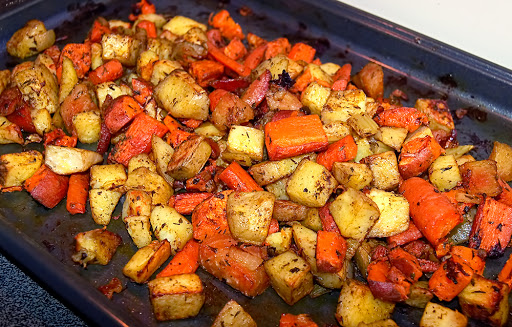 While the vegetables are roasting, in a small pan over medium-low heat, melt the butter and stir in the honey and pecans until well combined. About 10 minutes before the vegetables are done, drizzle the honey-pecan-butter over the vegetables and stir and toss to coat them evenly. Return to the oven for 10 minutes to glaze the vegetables.