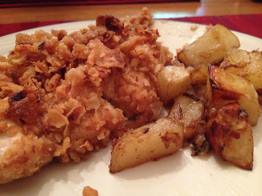 7. Pour the remaining onion straws over the top of the chicken.