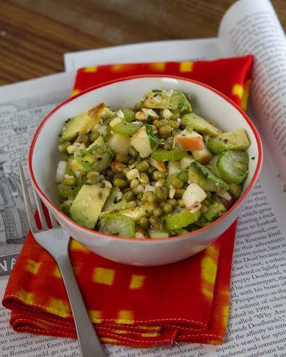 Mix the mung beans with the green onions, celery, apple, avocado, almonds, olive oil, parsley, lemon juice and salt and pepper. Toss well. Divide between two bowls and serve.