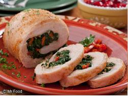 In a medium bowl, combine spinach, onion soup mix, and pimientos; mix well and set aside. Place turkey breast on flat surface, skin-side down. Evenly spread stuffing on top and roll turkey around stuffing, placing seam-side down in prepared baking dish.
