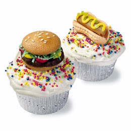 Top with the second vanilla wafer cookie, right side up (glue on with icing if needed). Rub the top“bun”with juice concentrate, then sprinkle with sesame seeds. Frost the cupcake with white icing, place the“burger”on top, and sprinkle on nonpareils.