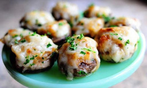 Place mushroom caps face down in a baking dish. Heap cavity with sauteed mushrooms, then sprinkle Gruyere over the top. Bake at 10 minutes on 325 degrees. Turn on broiler and broil for a couple of minutes, until the top of the Gruyere starts to bubble and slightly turn brown.