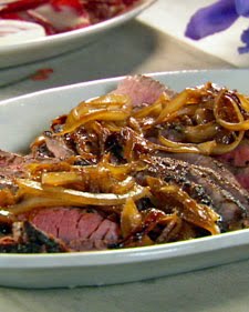 Pour any steak juices from the resting steak into the pan. Transfer the steak to a cutting board and slice into 1/4-inch slices. Lay the steak slices on a platter and pour the sauce over top and serve.