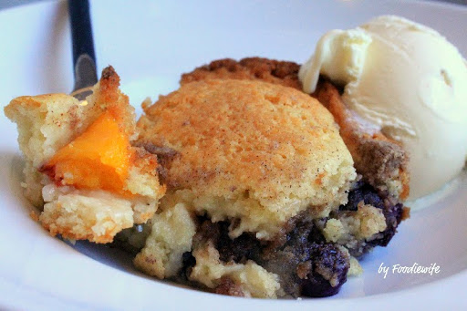 I adapted this recipe from "Our Best Bites". This cobbler would work very well with just about any kind of fruit-- a berry combination, just blueberries... use your imagination! I had some frozen peaches and leftover fresh blueberries, and I was very pleased with how beautifully this cobbler turned out! The dough has a touch of lemon zest, and just the right balance of sweet. It's very tender, as long as you don't overwork the dough. The cinnamon streusel, as it bakes, wafts throughout the house-- so comforting. We love our cobbler served warm, with vanilla ice cream. Fresh whipped cream works well, too! Please visit my food blog "A Feast for the Eyes" where I show you how to make this.